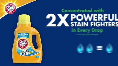 - DEEP CLEANING ARM & HAMMER DETERGENT IS POWERED Past OXICLEAN STAIN FIGHTERS. This supercharged liquid full-bodied stain removal detergent powers out dirt and odors using OxiClean, America'due south #1 stain remover additive make* (*based on units sold)